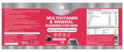 Glucose Syrup, Sugar, Water, Active ingredients premix (Ascorbic Acid, DLα-Tocopheryl Acetate 500, Retinyl Acetate, Nicotinamide, Calcium D Pantothenate, Ergocalciferol, Pyridoxine HCl, Cyanocobalamin 1%, Folic Acid, D-Biotin, Potassium Iodide, Zinc Citrate, Maltodextrin), Fruit juice concentrate (grape), Pectin (Gelling Agent), Citric Acid, Sodium Citrate (Acidity Regulator), Coconut Oil (Coating), Carnauba Wax (Anti-caking Agent), Natural Berry Flavour, Anthocyanins (Natural Colouring).